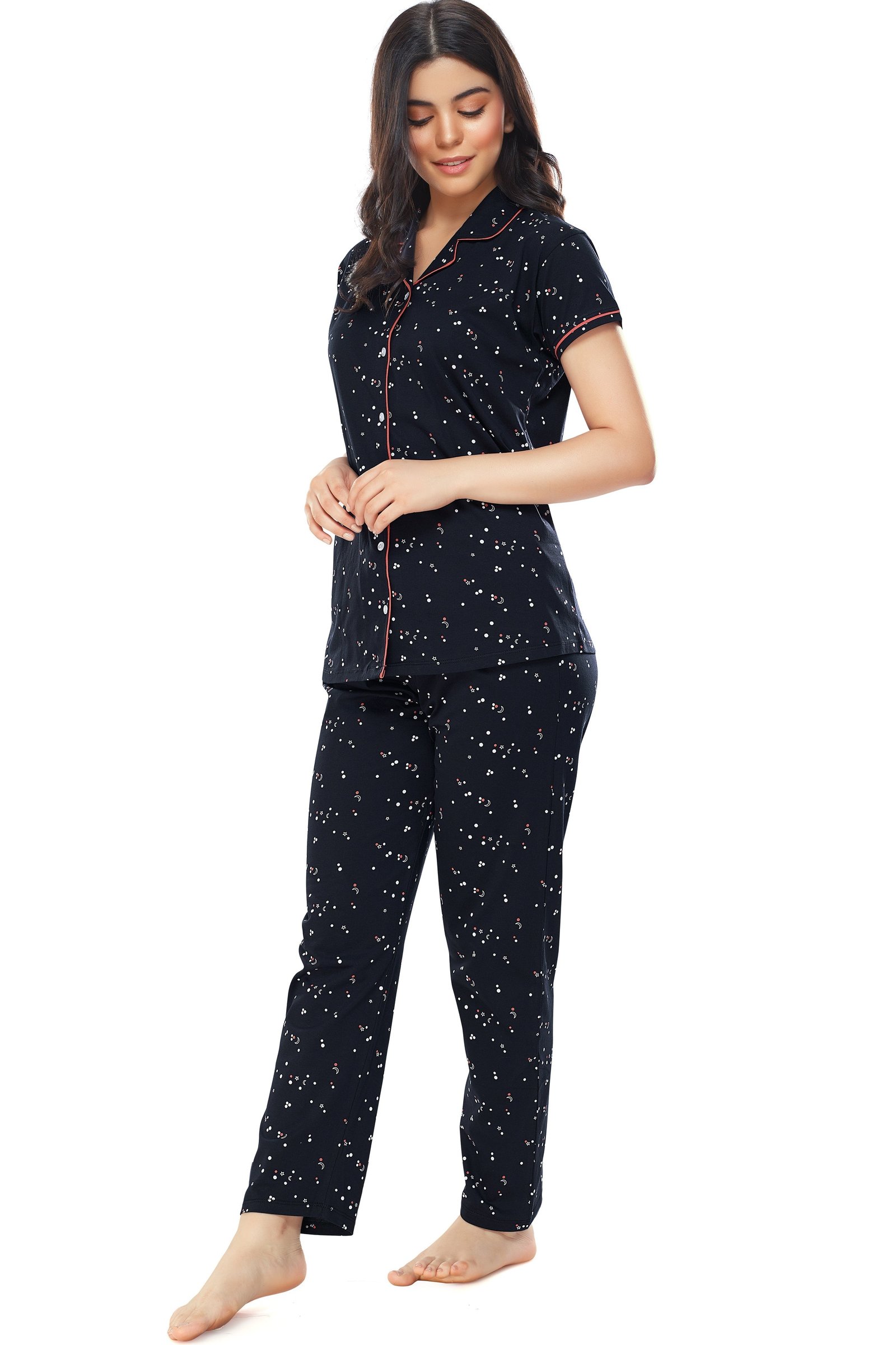 Women’s Cotton Navy Blue Star Printed Stylish Night Suit Set