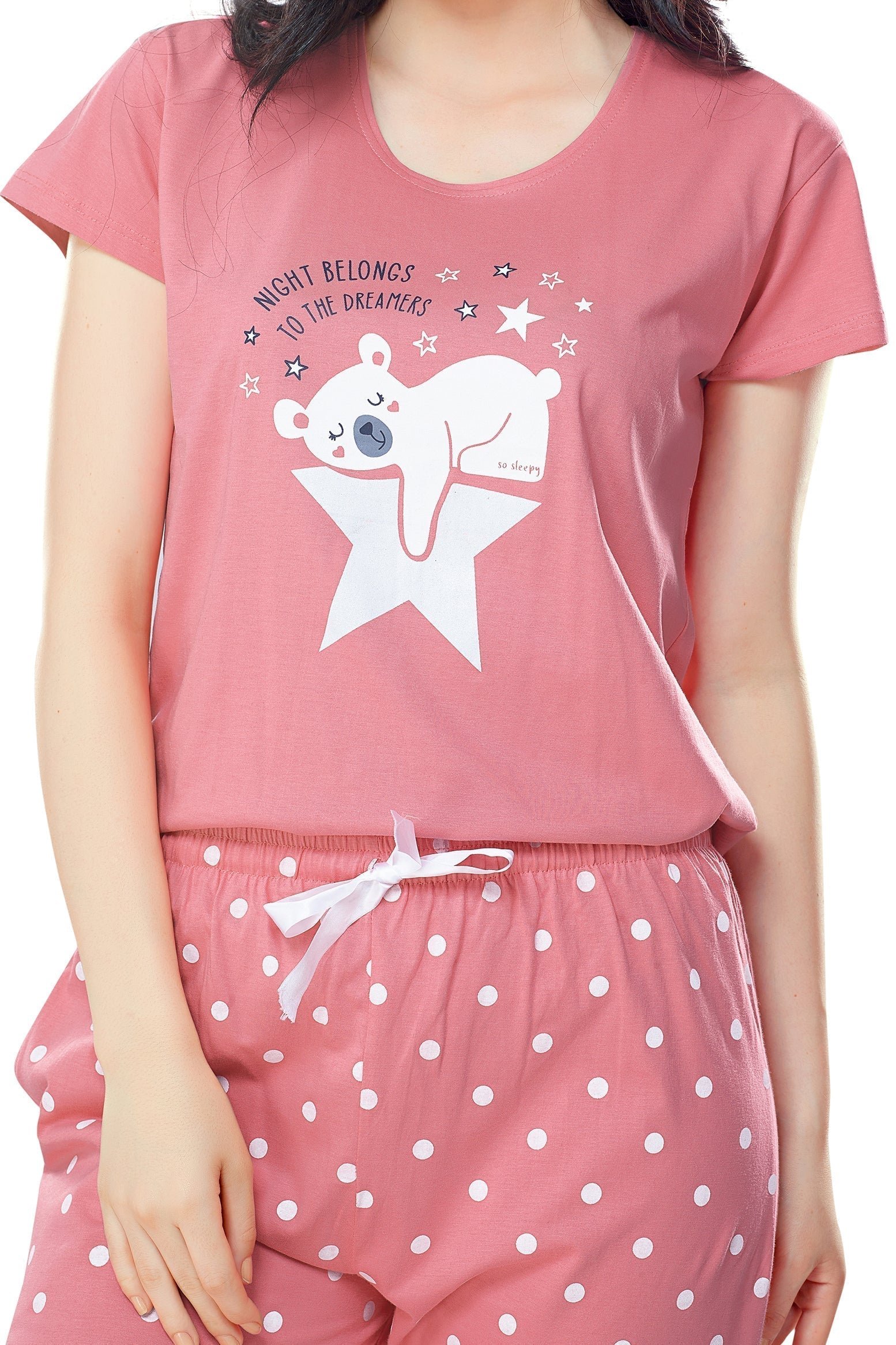 - A pair of pink polka dot printed pyjamas, has drawstring closure