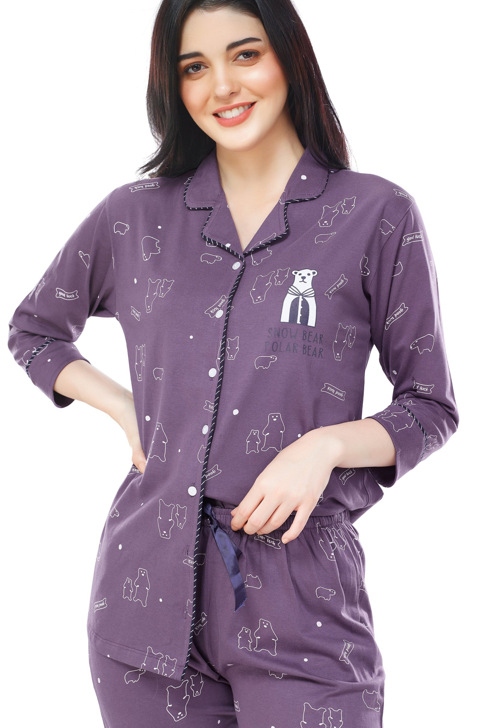 - Purple bear printed shirt, has a notched collar, three-quarter sleeves