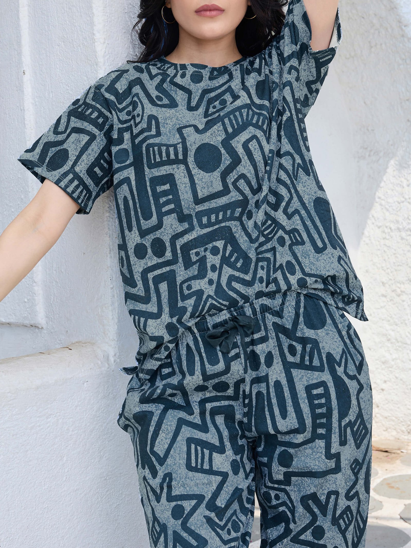 - Green Geometric Printed Cotton Night Dress of top and pyjamas
