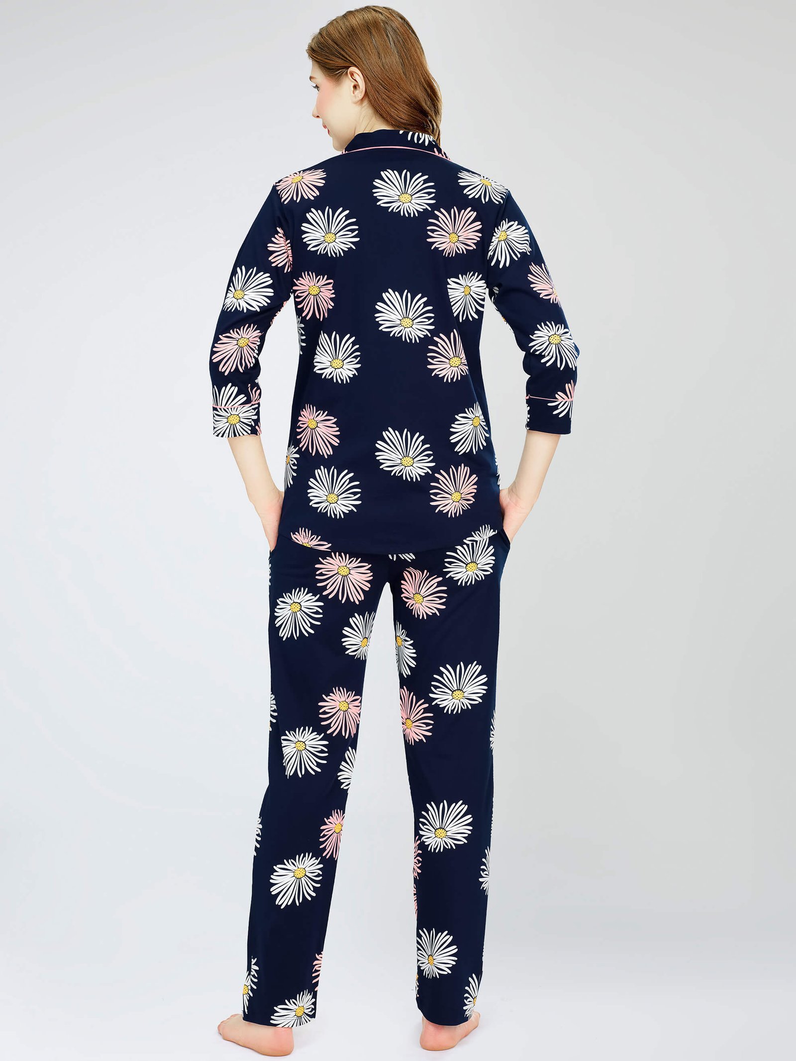 - Navy Blue Floral printed night suit consists of shirt and pyjamas