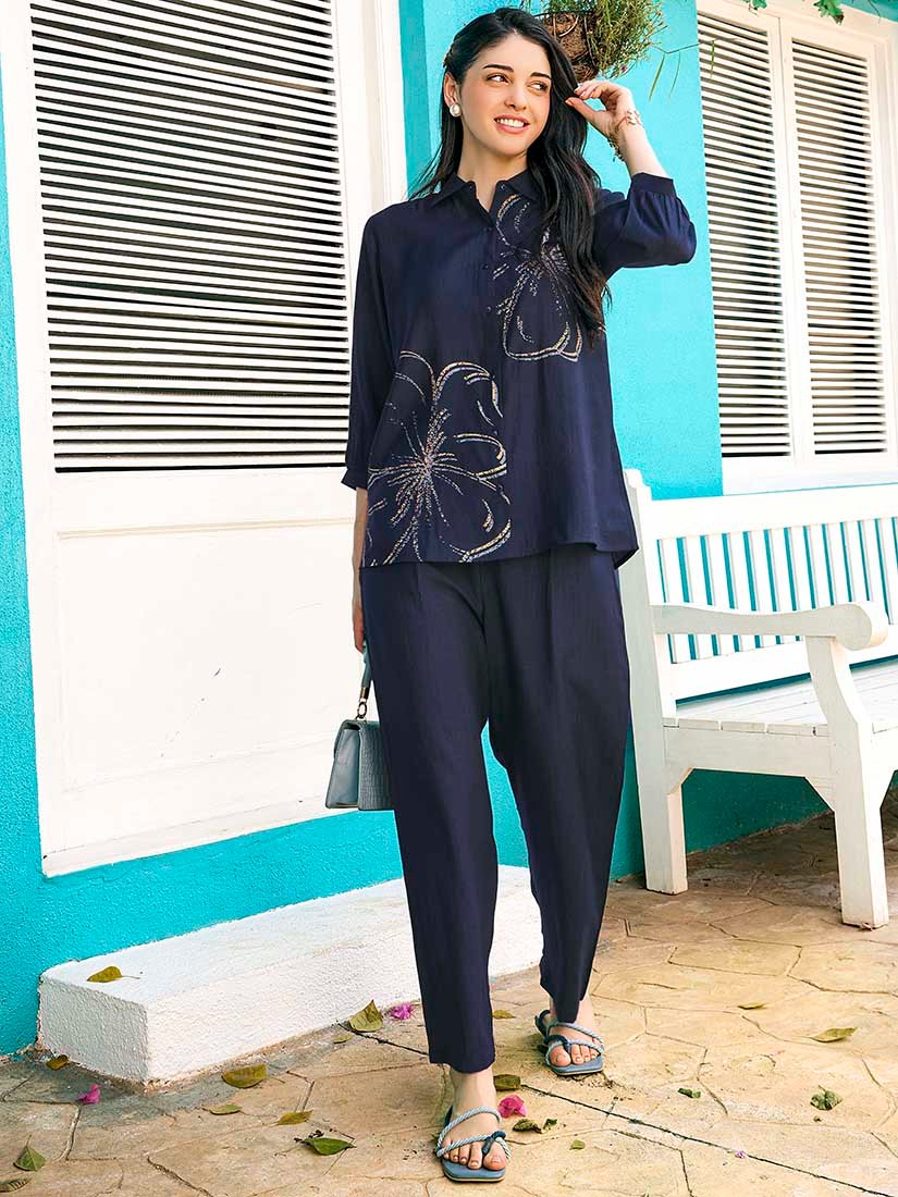 • Navy Blue Floral Printed Viscos consists of shirt and pyjamas