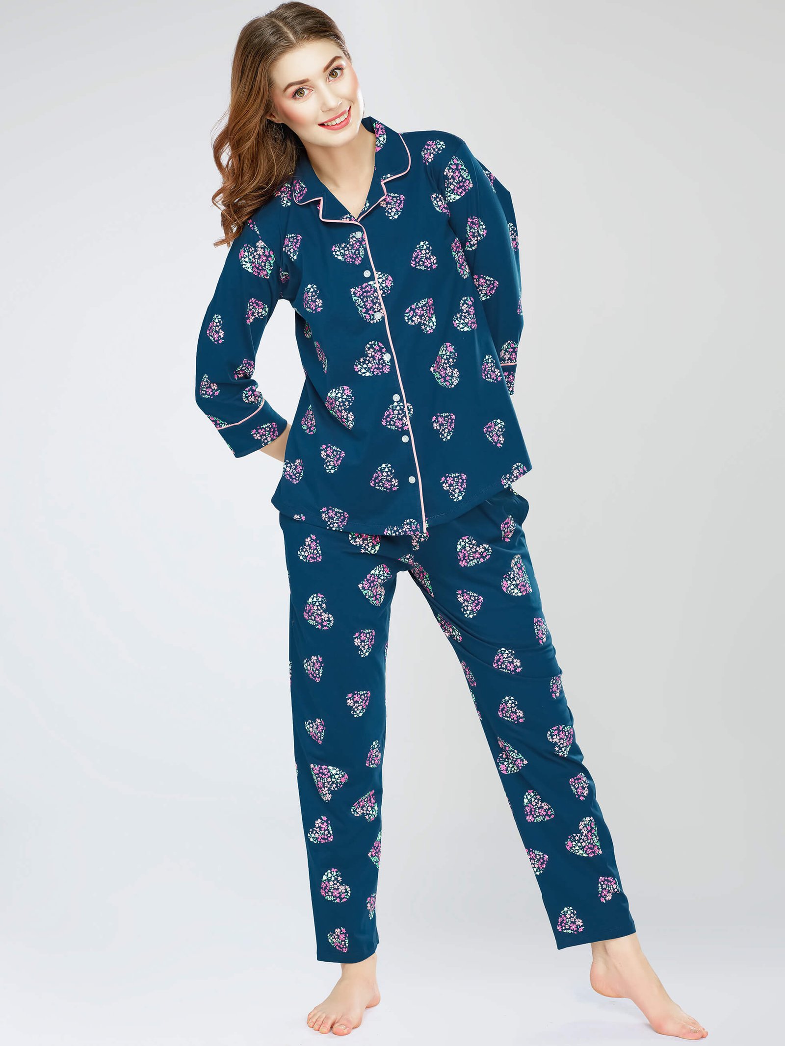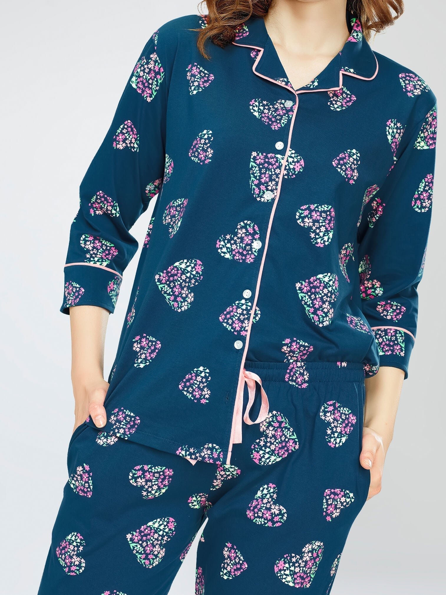 - Teal Blue Heart printed night suit consists of shirt and pyjamas